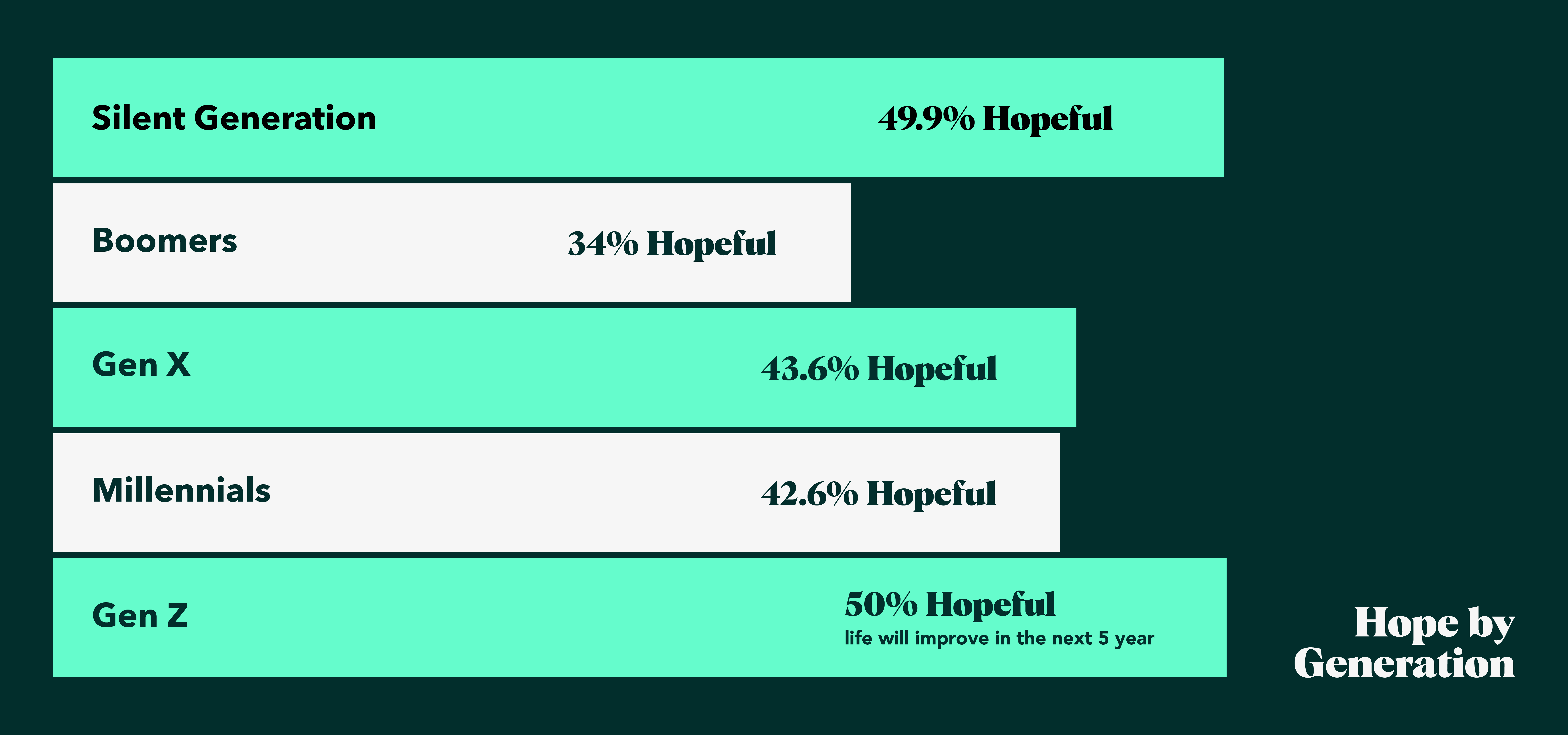 The significance of age and life-stage emerge as a key differentiator, with Gen Z being both the most hopeful (50%) and the least hopeless (15%) among surveyed generations, despite their heightened concerns about environmental and social issues. This suggests a correlation between hopefulness and youthfulness.