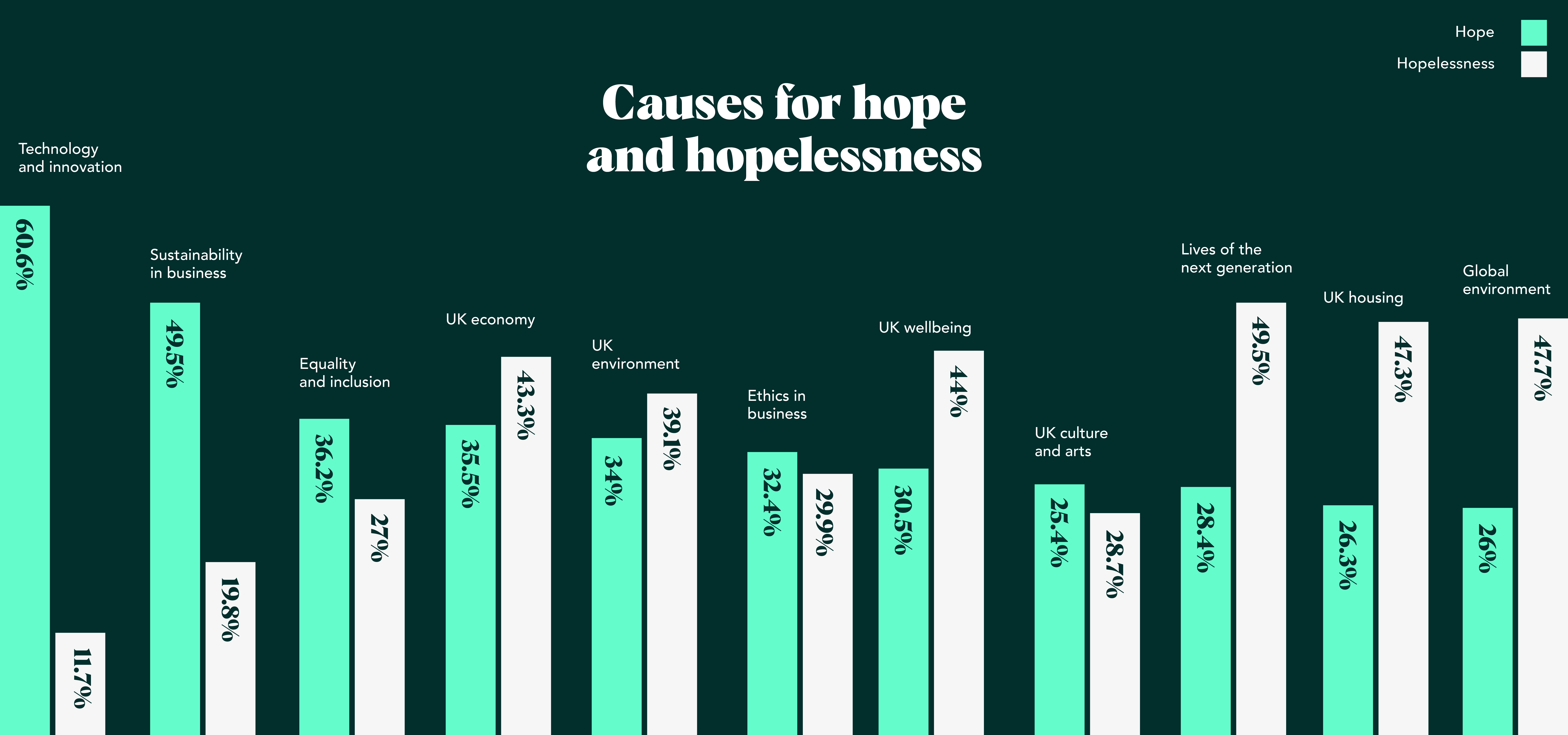 Amidst this bleak outlook, there are glimpses of optimism. Sustainable business practices emerge as the second highest reason for hope, with 1 in 2 expressing optimism about this area. Outranking this is improvements to technology and innovation.