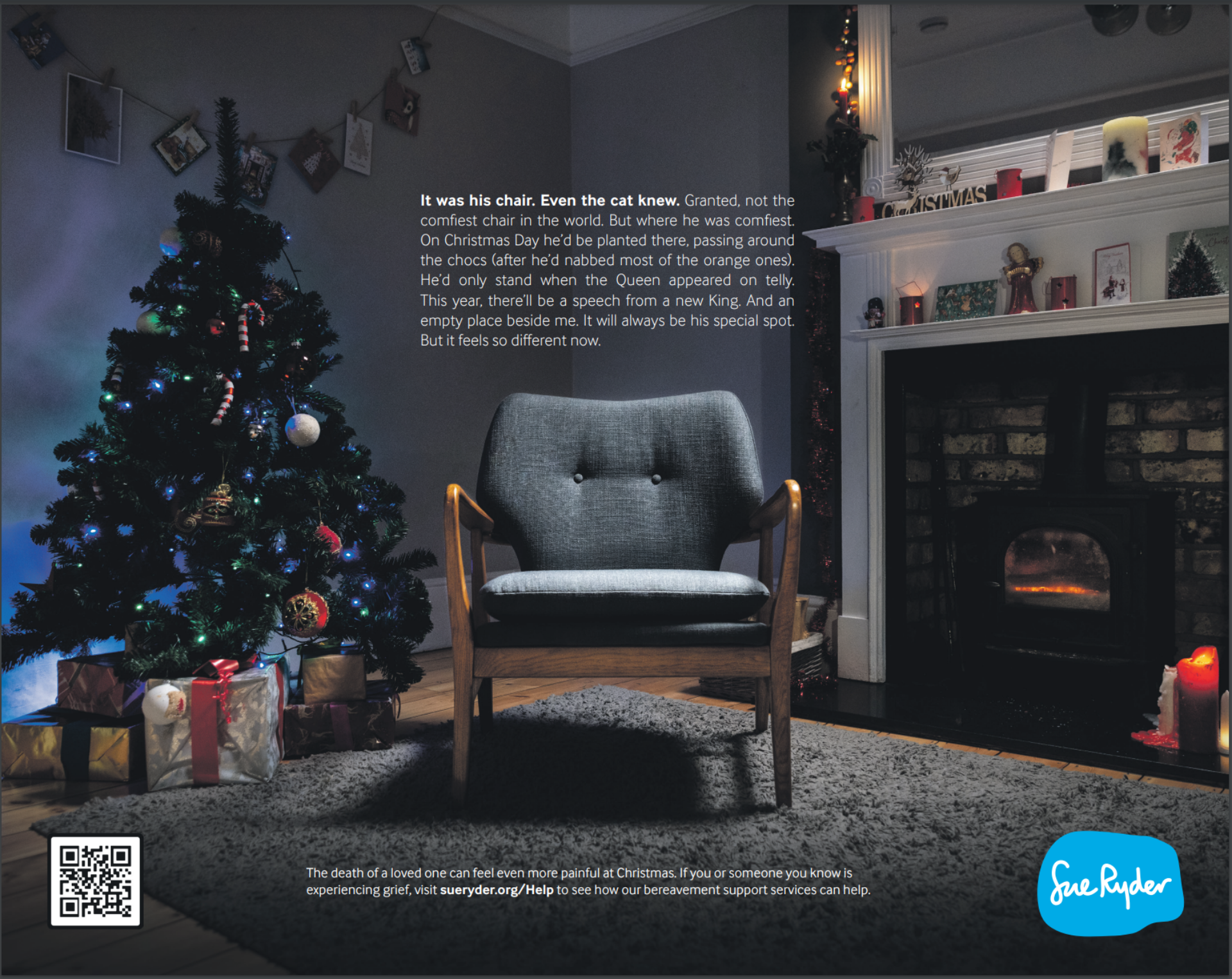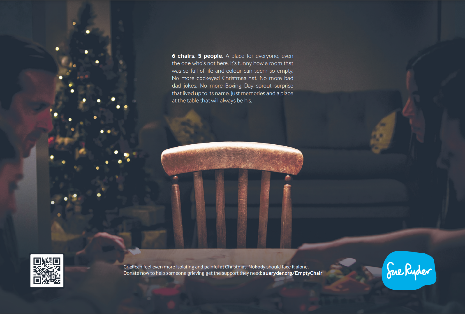 Bryn Attewell, Executive Creative Director at GOOD says “The empty chair is a poignant symbol of grief, but it is also a powerful truth that reflects the very real experience of thousands of people this Christmas. It was also a rare privilege to be able to create full-page, story-led press ads as part of the campaign, allowing us to explore the complex feelings associated with grief in a very human and emotional way.”